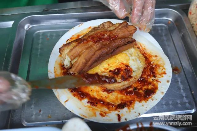 在古代,麥類制作的食物統(tǒng)稱為“餅”,米類制作的稱為“餌”,作為稻米之鄉(xiāng)的云南,不負(fù)眾望將米類吃食制作的爐火純青,餌塊便是除了米線之外的另一特色。燒餌塊和天津的煎餅果子類似,區(qū)別在于燒餌塊的餅皮是用煮熟的大米壓制成餅狀,并在無煙炭火上烤至金黃,加入老油條、雞蛋等,再涂上不同口味的醬料。食在昆明,每天叫醒你的不是夢想,而是熱乎乎的燒餌塊。