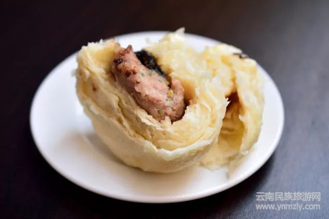 千層餅、千層派很常見,但“千層的包子”卻是滇味特色。它雖有包子的大致外型,但外皮兒、內(nèi)餡兒和普通包子截然不同。柔軟松酥的外皮入口即溶,餡心分為甜、咸兩種,咸餡兒主要包括鮮肉丁、冬菇、冬筍、玉蘭片等食材,甜餡兒則加入了熟云腿、白糖和蜂蜜等原料。其中數(shù)一數(shù)二的莫過于糖腿破酥包,半甜半咸的口味既有鮮咸口感、又甜而不膩,餡料香氣撲鼻,鐘愛云腿的人一定會愛上它。