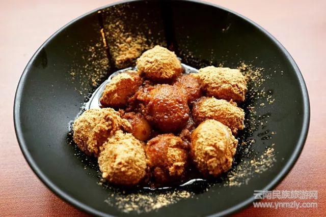 與過元宵節(jié)吃的晶瑩剔透的湯圓不同,豆面湯圓最大的特色就是表層的熟黃豆面,細(xì)膩糍糯的湯圓裹上滿滿的黃豆香味,再澆上熬得濃香的紅糖水,這道香甜的小吃是無數(shù)老昆明人的最愛。傳統(tǒng)的豆面湯圓是不包餡兒的,并須以上好的糯米和秈米混合成漿,濾掉水分形成吊漿面。如今豆面湯圓中也加入了花生、芝麻、紅豆等餡兒料,口感絕對不輸其他省份的同類小吃競品。