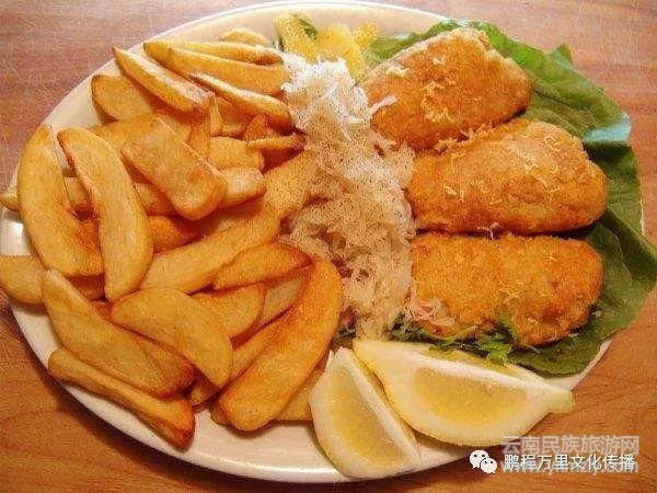 英國(guó)炸魚薯?xiàng)l,炸魚薯?xiàng)l源自英國(guó),是將去了魚刺和骨頭的魚,切成片后裹上濕面團(tuán),然后油炸,吃的時(shí)候還會(huì)配上不同口味的調(diào)味醬,算是種很普遍的街邊小吃。