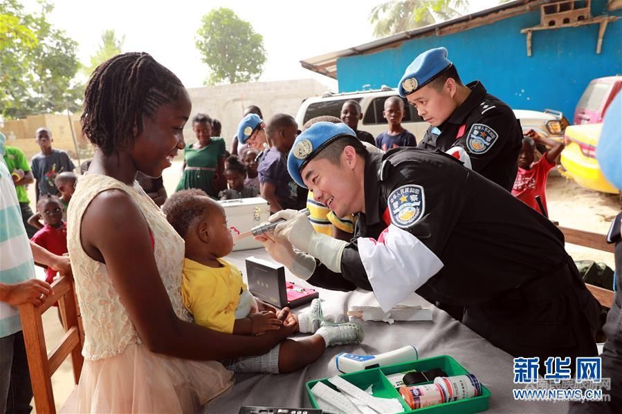 2017年12月28日,在利比里亞蒙羅維亞,中國維和警察防暴隊醫(yī)療人員為兒童做口腔檢查。當(dāng)日,中國第五支駐利比里亞維和警察防暴隊派出醫(yī)護(hù)人員前往蒙羅維亞市本森威爾社區(qū)孤兒院,為兒童和員工進(jìn)行義診。新華社發(fā)(趙小新攝)