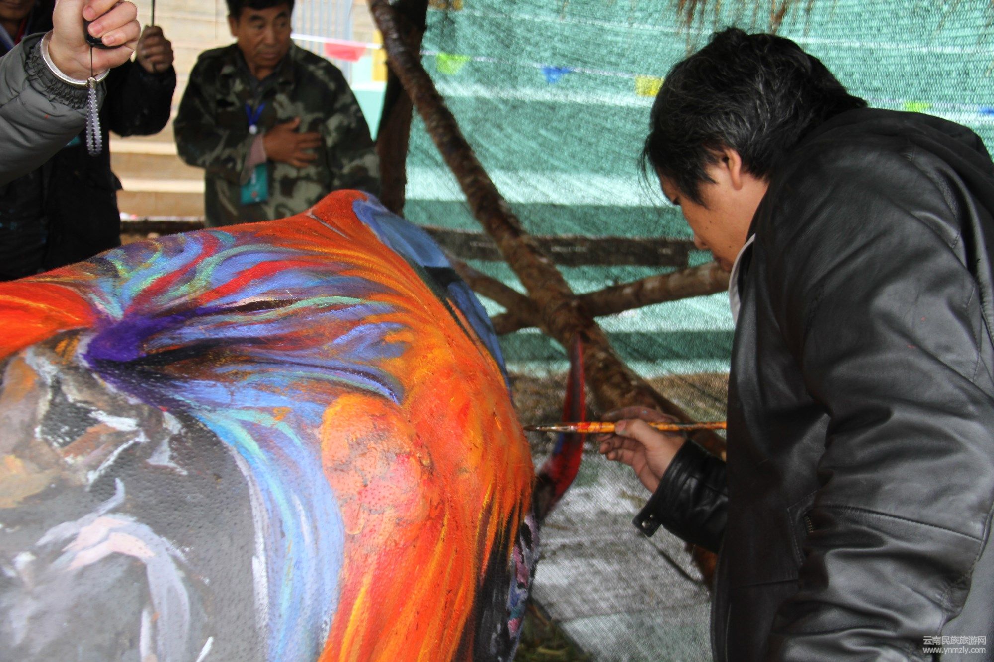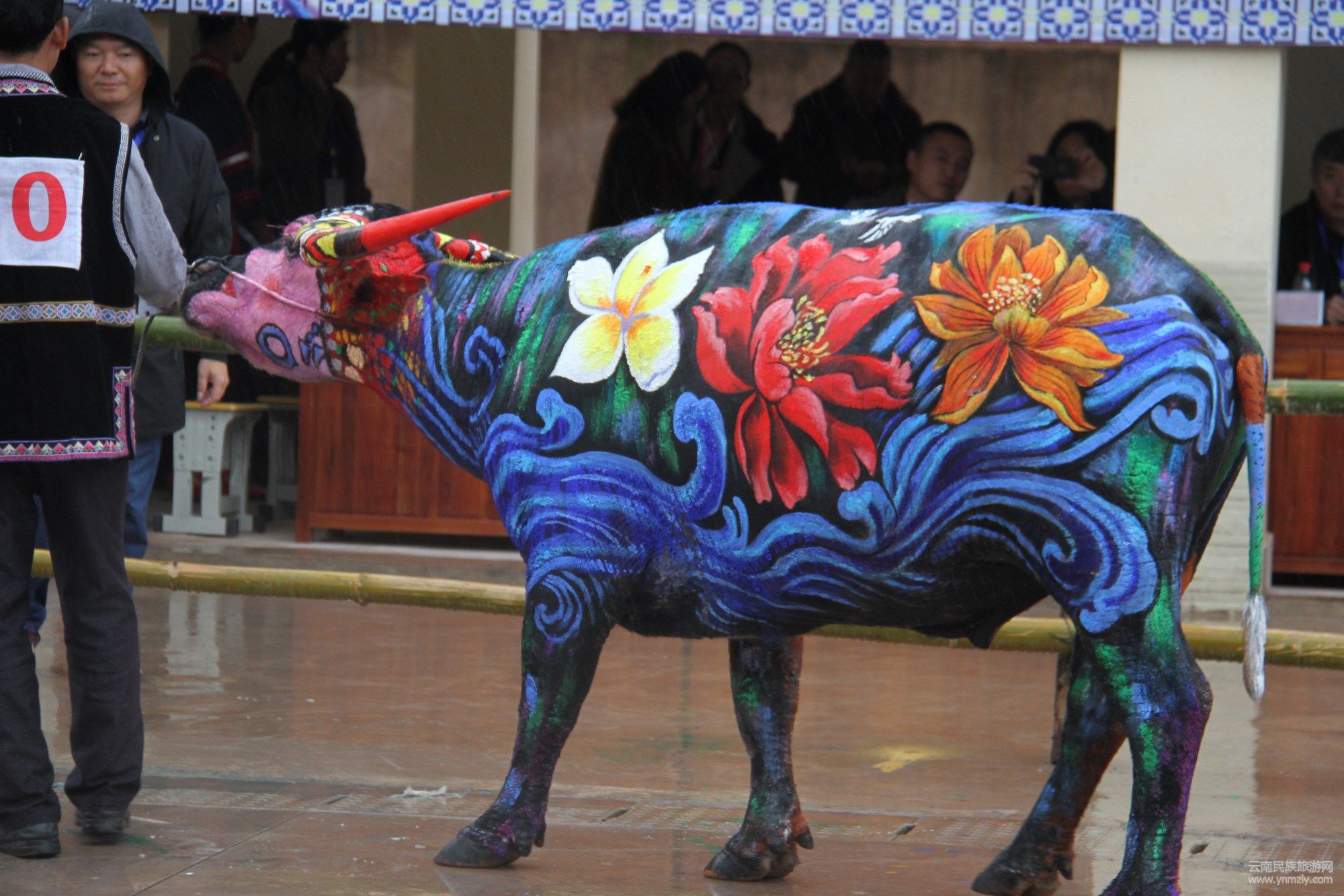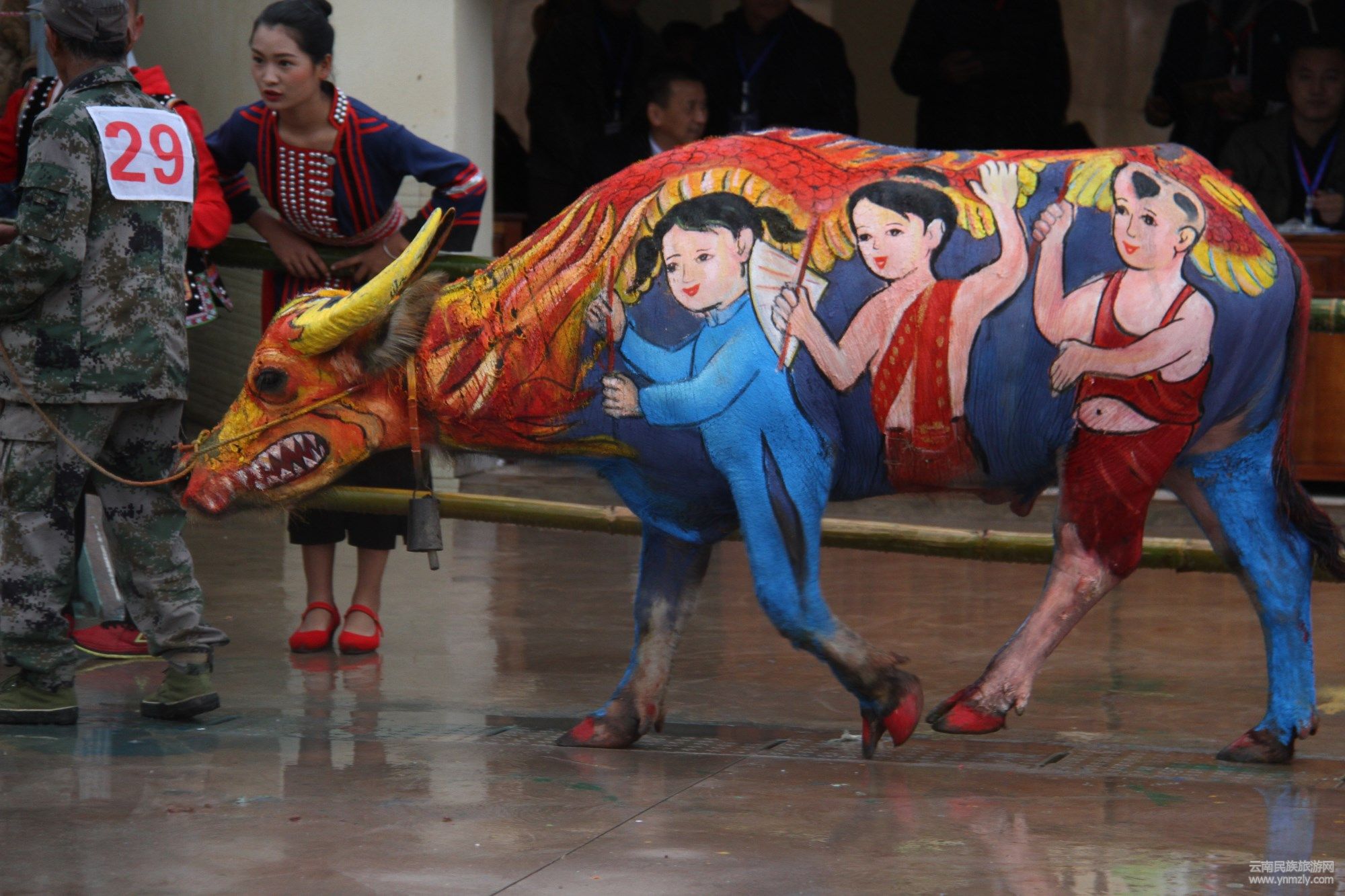 比賽之前,參賽隊(duì)們提前給牛洗好了澡,剃了牛毛,準(zhǔn)備在比賽時(shí)大顯身手。各參賽繪畫師們專心致志、一絲不茍著揮動(dòng)著手中的畫筆,懷著對(duì)藝術(shù)的無限追求,盡情揮灑,在牛的身上描繪出一幅幅活靈活現(xiàn)的圖案。賽場(chǎng)上,一條條色彩斑斕的火牛昂首挺胸地走動(dòng)著,向人們展示著大豐收、美麗中國(guó)夢(mèng)、祥和的邊城等在黨的領(lǐng)導(dǎo)和各族人民的共同努力下所取得的豐碩成果。