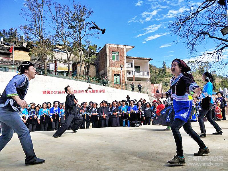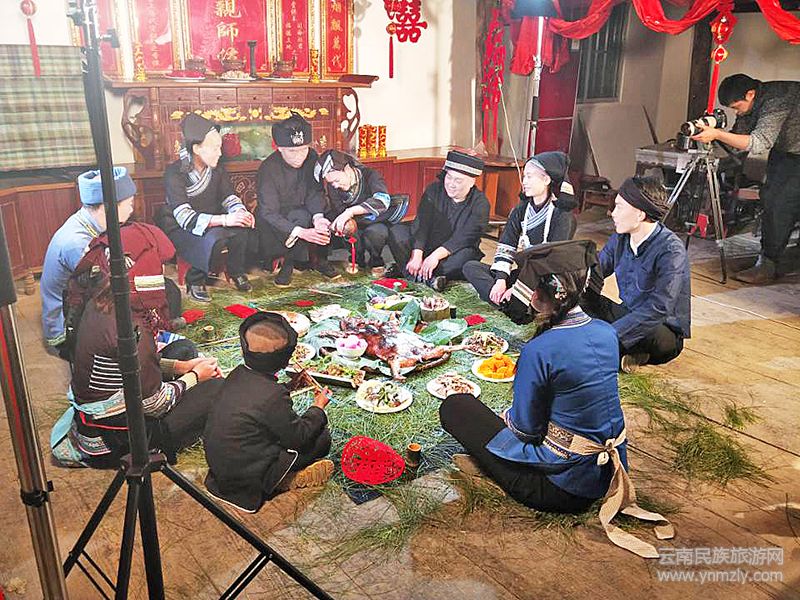 1月6日,大矣勒村冬日的清晨格外溫和,遠(yuǎn)近的農(nóng)戶家門頭都掛上了紅燈籠,百余名身著壯族節(jié)日盛裝的男女老少,聚集在村口,排隊(duì)為賓客掛上祝福的紅雞蛋,并引導(dǎo)賓客們跳竹桿舞進(jìn)村。然后村里人和“賓客”們一起表演碰雞蛋、打雞毛毽等活動(dòng),把結(jié)婚的氛圍營造得濃濃的。午飯時(shí)分,娶親儀式開展,打扮漂亮的“新娘”和帥氣的“新郎”,在布置一新的房屋里,在丘北壯族文化傳承人張志松等人的主持下,舉行了從娘家嫁到夫家的整個(gè)過程,10余個(gè)儀式每一道程序均按照壯族黑沙支系的儀式原本再現(xiàn),儀式程序之多、表達(dá)寓意之含蓄,讓導(dǎo)演感慨丘北壯文化何其豐厚。與此同時(shí),在貼有迎新春對聯(lián)、掛滿火紅燈籠的古樸的街道上,長街宴擺上,20余桌壯族特色菜上起,進(jìn)用午餐的時(shí)候,在屋內(nèi)敬完長輩家人后,新娘新郎逐桌給客人敬酒,并和陪郎伴娘們一起給大家奉上動(dòng)聽的壯族歌聲。所有儀式完畢,太陽即將落山。