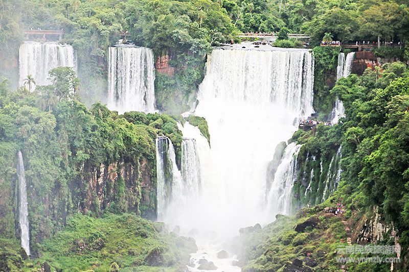 沿步行道沿途觀賞不同大小,不同形狀,不同寬窄的伊瓜蘇瀑布,各有其美。而大瀑布傾倒而下的水霧,則在陽光一出來時(shí),必定生出彩虹。這河谷間不停歇的水霧,彩虹,與森林輝映,與天地共存。奔騰咆哮的瀑布之聲,雷霆萬鈞。