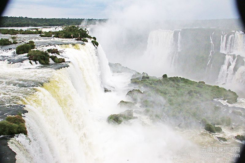 昨天乘直升飛機(jī)從空中看了伊瓜蘇瀑布,直觀感受了伊瓜蘇瀑布的行成,特別是她與其他瀑布不一樣的地方:不是一字排開的形狀,而是以一個(gè)類似馬蹄形的大瀑布為主,延伸出其它275個(gè)大小不等、寬窄不一、臺(tái)節(jié)、層級(jí)不同的瀑布。
