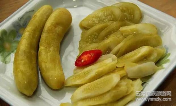 腌制品一直都是云南人最愛的零嘴,用一個(gè)大大的玻璃缸,把黃瓜放入鹽水浸泡著黃瓜等,時(shí)間一久,黃瓜色澤暗淡發(fā)黃,這時(shí)候是最好吃的時(shí)候。