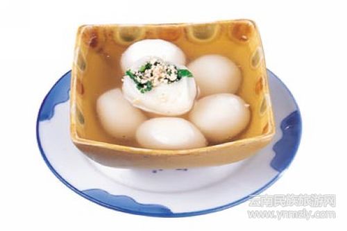 可說是層次感最豐富的湯圓,不少云南人到現(xiàn)在依然保持著過年吃“定心湯圓”的習(xí)慣。說到定心湯圓,其餡料有火腿、花生粒及曬干的桔皮,豐富的餡料讓湯圓的味道和普通湯圓有了明顯差別,干桔皮的加入讓甜膩的湯圓餡增添了一份清馨。最精彩的是湯底,是用發(fā)酵后的玫瑰糖調(diào)制而成,所以吃時也有講究,要將湯圓切開讓花生粒及桔皮的香與帶清醇酒香的玫瑰花湯融為一體,幾種香味同時向味蕾沖擊,實(shí)在非比尋常。