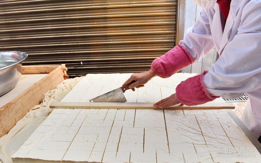 將豆腐劃開。(吳再忠 攝)