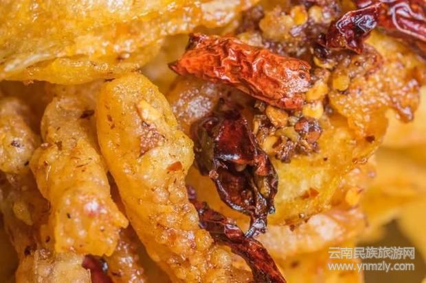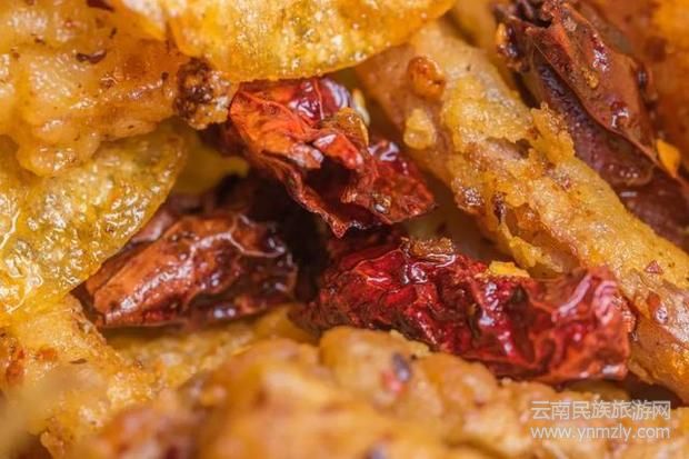 由于加入干辣椒和各種配料腌制了很長時(shí)間,又油炸至香脆無比,絕對(duì)是下酒菜排行榜第一的菜品。