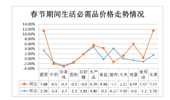 節(jié)日期間,糧油、禽蛋、蔬菜、肉類、水產(chǎn)品等生活必需品價(jià)格總體平穩(wěn)。所監(jiān)測的12類重要生活必需品價(jià)格呈6漲6跌的態(tài)勢,其中,蔬菜、白砂糖、水產(chǎn)品、豬肉、大米、水果市場零售價(jià)格與節(jié)前相比均上漲,漲幅分別為3.39%、1.81%、4.8%、4.23%、0.03%、1.5%;牛奶、白條雞、面粉、食鹽、鮮雞蛋、食用油市場零售價(jià)格與節(jié)前相比下跌,跌幅分別為1.42%、2.76%、1.37%、0.21%、0.67%、1.25%。