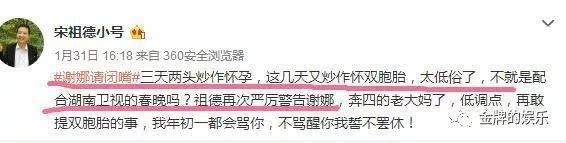 而這其中,宋祖德的話,估計(jì)也代表了一些聲音,在這幾天的微博上,宋祖德就直言,謝娜三番兩次的炒作雙胞胎的消息,最終的目的是要配合湖南衛(wèi)視的春晚。