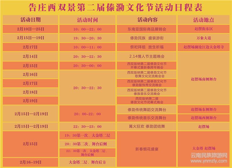 據(jù)了解,西雙版納傣泐文化節(jié)開幕式晚會將于15日20時30分在告莊西雙景趕擺場舉行?;顒舆€將舉辦西雙版納傣泐文化節(jié)歌舞文化交流晚會、傣族服飾秀晚會、傣族音樂交流晚會、閉幕式晚會以及新春煙花盛宴、傣泐民族盛裝游街活動等民間文藝交流活動。