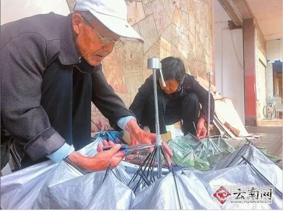 但昆明市新聞路一家銀行外的臺階上,有一對七旬老夫妻,他們幾乎每天都在這里擺攤修傘,風(fēng)雨無阻十多年如一日。丈夫修傘,老伴在一旁打下手,樸實、簡陋的攤子,在老人手中,開出一朵朵傘花。