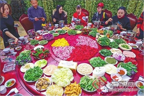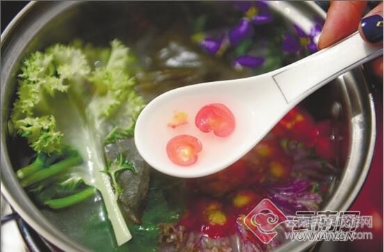 在嵩明花博園,滿(mǎn)桌鮮花食材,艷麗繽紛五彩十色。落座后安靜地欣賞,誰(shuí)也不愿動(dòng)第一筷。火鍋是每人一個(gè),五彩十色的花盡管往里投,滿(mǎn)滿(mǎn)一桌鮮花宴400元,人均消費(fèi)僅40元。