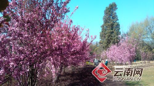 在薔薇區(qū)還有一條目前昆明市垂絲海棠集中列植數(shù)量最多的環(huán)形“海棠大道”。海棠大道長400米,由300余株垂絲海棠、西府海棠、湖北海棠組成,花色粉白,團(tuán)簇枝頭,迎風(fēng)輕蕩,營造出植物園春季賞花的一個新景點。