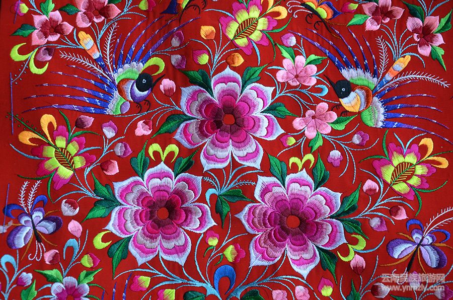 彝族刺繡方法看似簡單,但技術(shù)水平較難。先在紙上描繪出花、草、樹、鳥、蟲、魚、火等千姿百態(tài)、栩栩如生的精美圖案,然后粘貼于準(zhǔn)備好的布料上,憑著繡娘的想象和審美需要,對照圖案選用不同顏色、不同粗細、不同材質(zhì)的繡線搭配,最后再通過手工一針一線進行繡制。彝族刺繡的婦女想象力豐富,描繪的圖案顏色繁復(fù),隨心所欲而如云出于岫,沒有固定的模式,自然清新質(zhì)樸。茶花代表孩子將來聰明伶俐、氣質(zhì)非凡;蝴蝶代表孩子將來能找到個好人家、榮華富貴、吉祥如意等等。