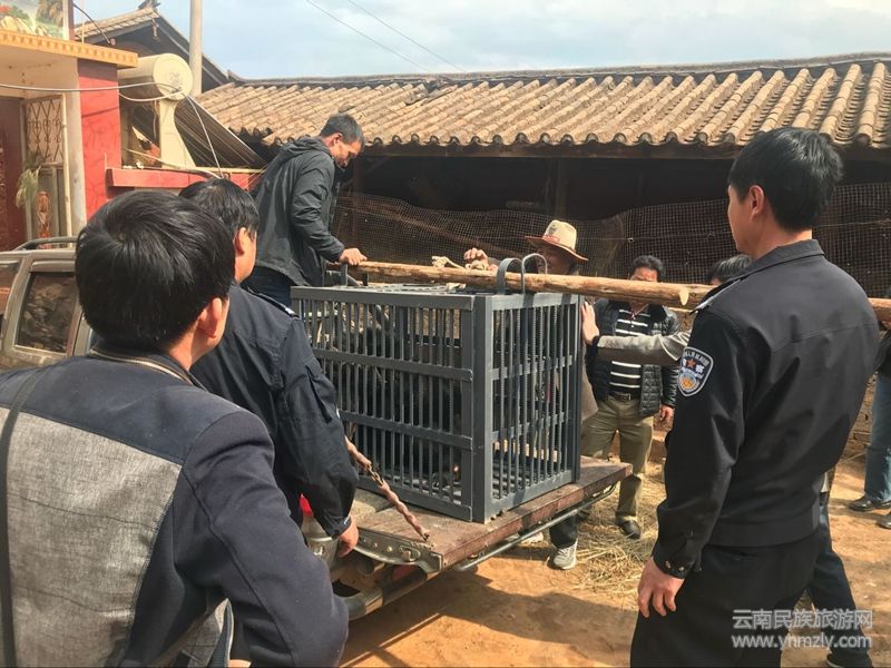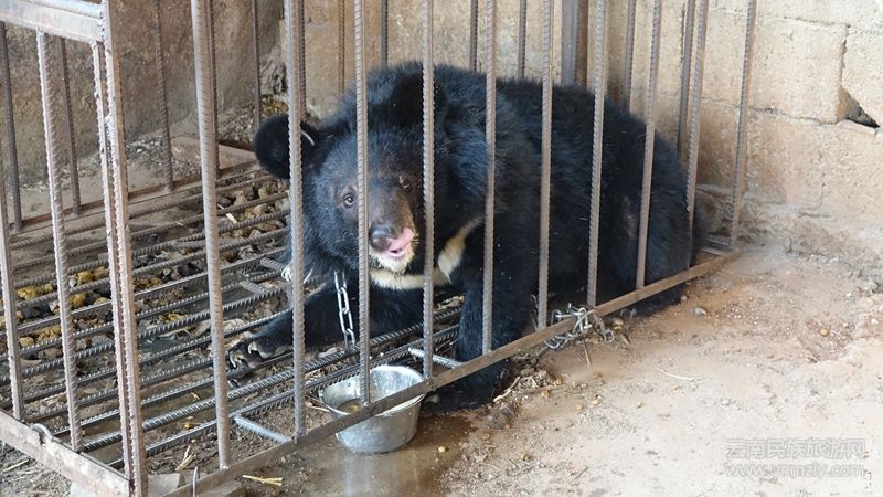 永勝縣森林公安局接到這一信息后立即組織南片派出所民警前往現(xiàn)場(chǎng)調(diào)查。經(jīng)調(diào)查,在2015年4月的一天早上,期納鎮(zhèn)半坪村委會(huì)下云村村民楊某某與同村村民共三人到永勝縣期納鎮(zhèn)街西村委會(huì)大火山后山去找蘑菇,在途徑永勝縣期納鎮(zhèn)街西村委會(huì)老媧箐時(shí)發(fā)現(xiàn)一只貌似小狗的動(dòng)物,因楊某某是一個(gè)野生動(dòng)物愛(ài)好者,將其帶回家中喂養(yǎng),逐漸長(zhǎng)大才知道是一頭黑熊,此熊現(xiàn)體重約達(dá)80公斤。經(jīng)鑒定,此熊為亞洲黑熊,屬于國(guó)家二級(jí)保護(hù)動(dòng)物。楊某某在無(wú)馴養(yǎng)許可證的情況下馴養(yǎng)野生黑熊,其行為涉嫌無(wú)馴養(yǎng)繁殖許可證馴養(yǎng)繁殖野生動(dòng)物。
