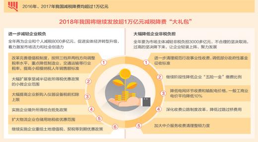 “減稅降費仍是今年的主基調,而且從《政府工作報告》的表述來看,減負力度有增無減。”胡怡建說,近年來,作為降成本最重要的手段,大規(guī)模減稅降費在推動供給側改革方面發(fā)揮了不可替代的作用。國家統計局公布的數據顯示,2016年和2017年,我國各項減稅降費的規(guī)模都超過萬億元。