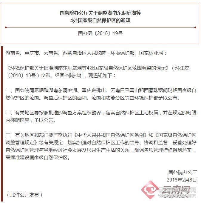 云南網(wǎng)訊(記者 趙黎浩)日前,國務(wù)院辦公廳下發(fā)文件《國務(wù)院辦公廳關(guān)于調(diào)整湖南東洞庭湖等4處國家級自然保護(hù)區(qū)的通知》(以下簡稱《通知》),批準(zhǔn)云南白馬雪山等4處國家級自然保護(hù)區(qū)調(diào)整保護(hù)區(qū)范圍。此次調(diào)整將涉及保護(hù)區(qū)的面積、范圍和功能分區(qū)等,后續(xù)將由環(huán)境保護(hù)部予以公布調(diào)整細(xì)節(jié)。