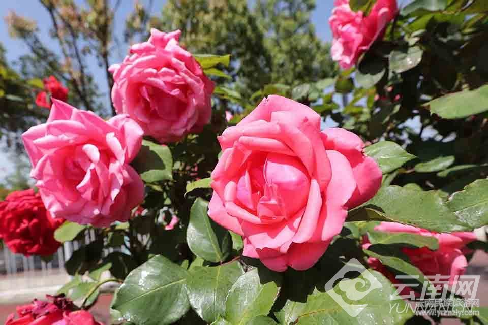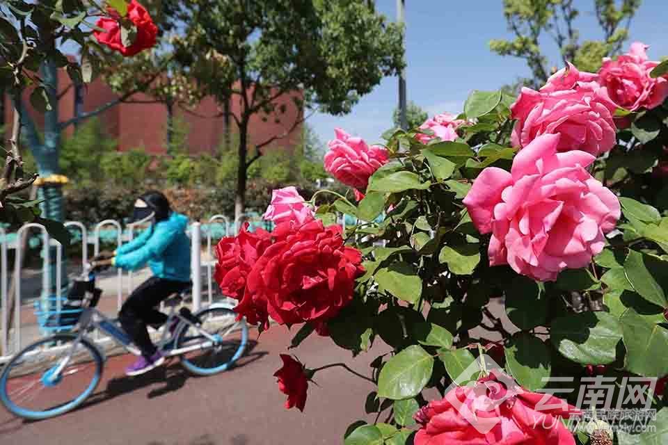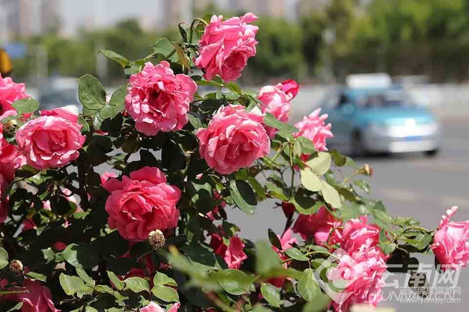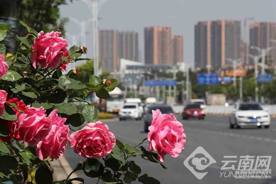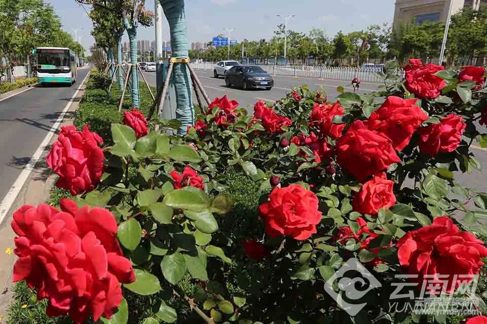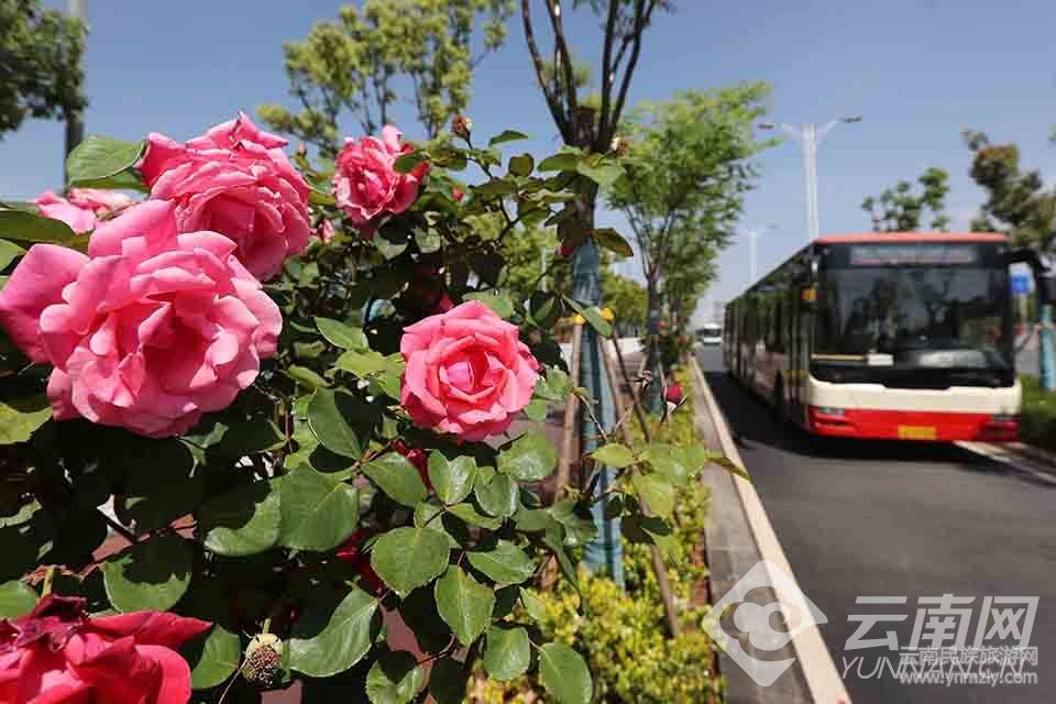 昆明市廣福路沿途綠化帶的嫁接“月季樹”繁花似錦,扮靚街區(qū)。