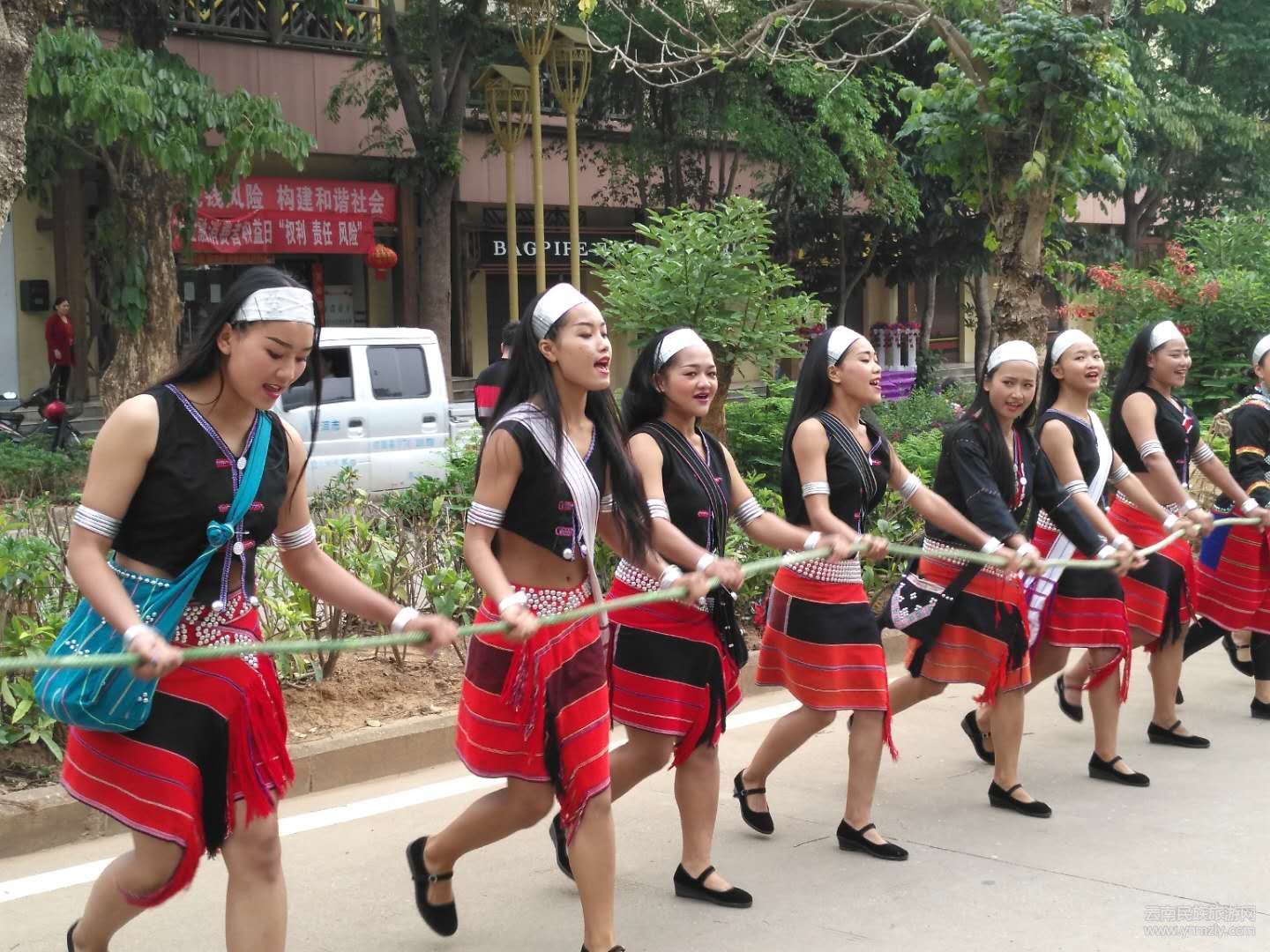 在這里,佤族小伙子展開兩大盤綠色的繩索,拴在“鼓神”兩側(cè)。之后,在陣陣有節(jié)奏的號子聲中,佤族小伙和姑娘們緩慢地拉著“鼓神”,往勐梭龍?zhí)缎羞M。中間,不斷有游客和市民加入“拉木鼓”的行列,全民“拉木鼓”的舉動,也讓游客們感受到了佤族部落傳統(tǒng)民俗的魅力。