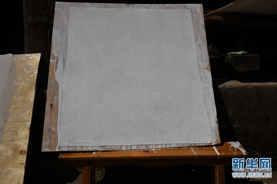 上漿完成后,要把布放在太陽下晾曬,晾曬完成,再用光滑的石頭反復打磨布,方便作畫。(新華網(wǎng) 韓文萍、馬航/文 李寧/圖)