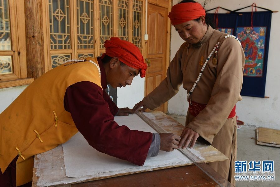 畫布晾干,和嘉龍與麗江市東巴畫市級非遺傳承人楊正元一起打線條。(新華網(wǎng) 韓文萍、馬航/文 李寧/圖)