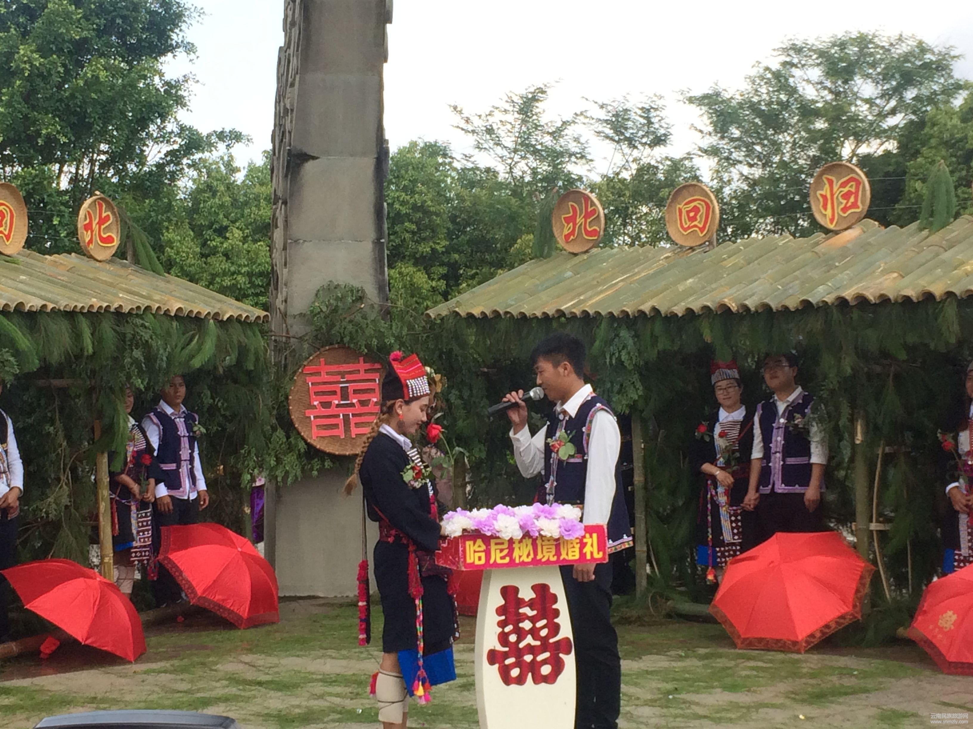 巡游結(jié)束后,在墨江北回歸線標(biāo)志園頂舉行了哈尼秘境婚禮生動(dòng)再現(xiàn)了哈尼族阿木支系的傳統(tǒng)婚俗,通過橄欖迎親、說親、郎舅背親、哭嫁、送嫁、郎舅堵門等一系列婚禮流程,新人們終成眷屬,共飲雙胞水等一系列活動(dòng)。看著他們滿臉幸福的準(zhǔn)備攜手一生,現(xiàn)場的觀眾心里充斥著滿滿的感動(dòng)。