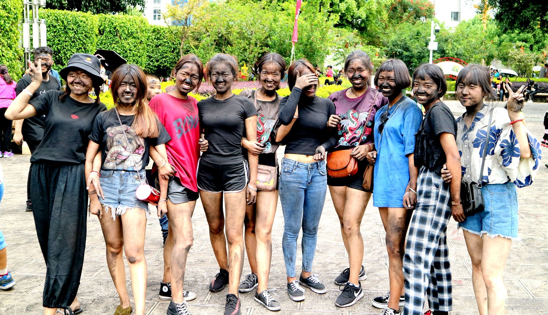 中午12點(diǎn)30分,來自世界各地的上萬名游客在太陽廣場參加摸黑臉活動(dòng),廣場四周分別用木桌支起幾口底朝天的大鍋。無論男女老幼,紛紛向鍋底一摸,便沖向人群加入“抹黑大戰(zhàn)”。人潮中幾乎無一人幸免,游客整張臉都被抹得只見忽閃的眼睛和咧嘴笑露出的牙齒。就連在現(xiàn)場維持秩序的民警也“難逃一劫”。墨江哈尼族,素有“拜火”的傳統(tǒng),當(dāng)?shù)厝藢⒑诨乙暈?ldquo;火的結(jié)晶”,是吉祥的象征。在喜慶的場合,當(dāng)?shù)厝顺S?ldquo;抹黑你”來表達(dá)祝福。抹黑滿臉,代表開心永久、快樂永久;抹黑得越多,意味著幸福就越多。這就是墨江人歡迎、祝福來自遠(yuǎn)方來客人的一種特殊方式。