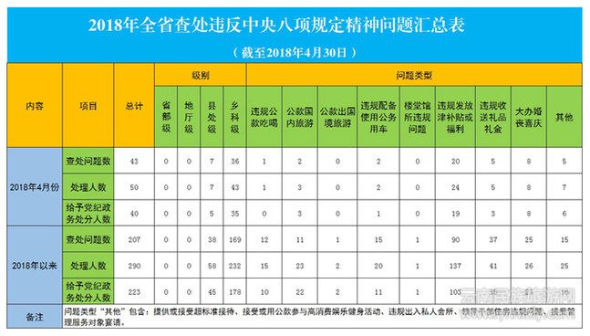 2018年4月,云南省各級紀(jì)檢監(jiān)察機(jī)關(guān)查處違反中央八項規(guī)定精神問題43起,處理50人,給予黨紀(jì)政務(wù)處分40人。