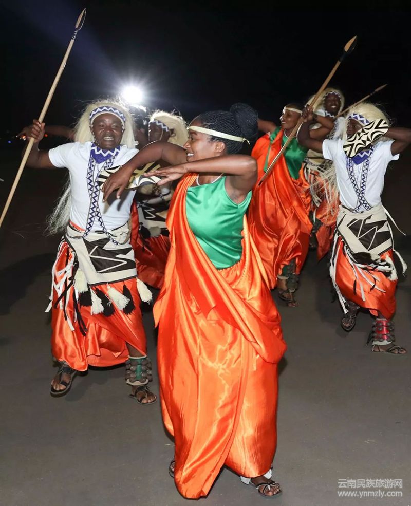 夜色中,盧旺達民眾跳起熱情的民族舞,歡迎習近平主席和夫人彭麗媛。新華社記者 龐興雷攝