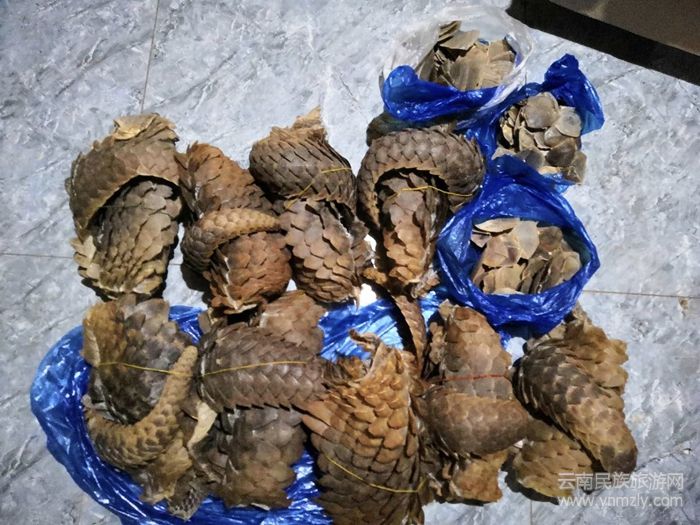 經(jīng)清點(diǎn),共查獲疑似穿山甲皮9套、穿山甲片269片;麂子角(面部)6副;麂子腳8件;豪豬刺510根;野牛膽2個(gè);巖羊角3對(duì);象皮3塊。