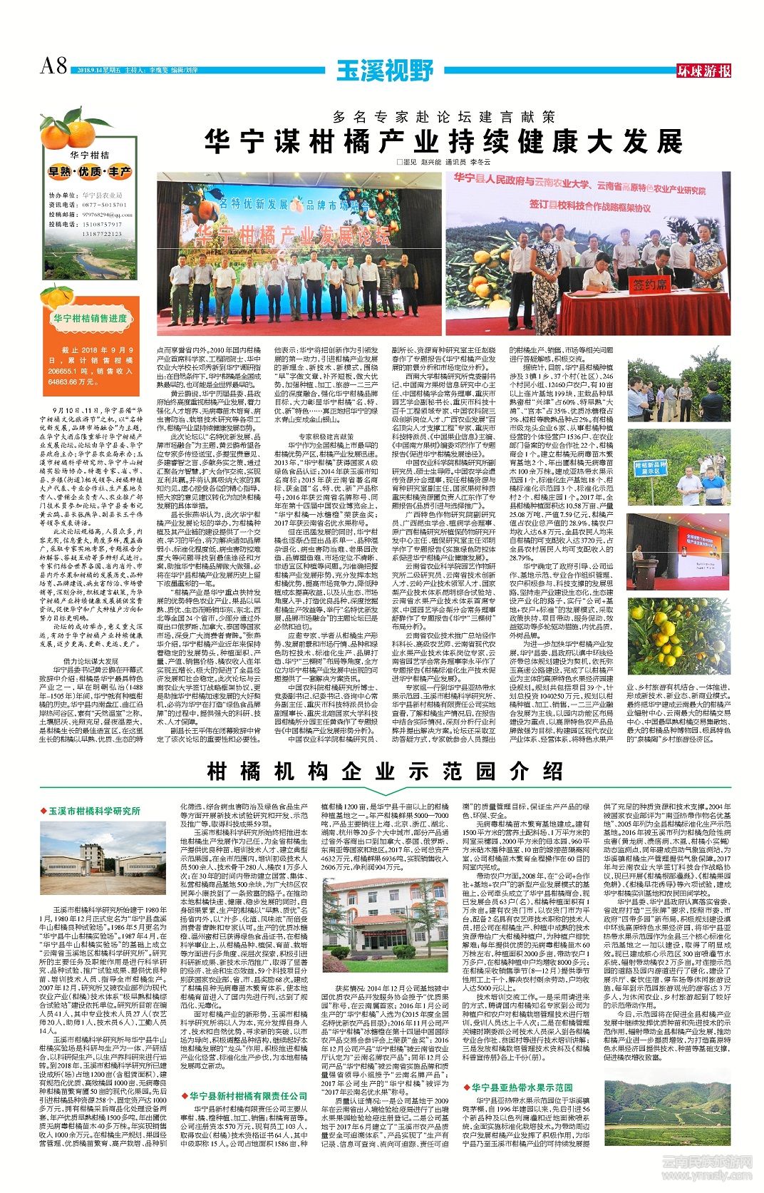 “柑橘產(chǎn)業(yè)是華寧重點(diǎn)扶持發(fā)展的優(yōu)勢(shì)特色農(nóng)業(yè)產(chǎn)業(yè),果品以早熟、質(zhì)優(yōu)、生態(tài)而暢銷華東、東北、西北等全國(guó)24個(gè)省市,少部分通過外商出口俄羅斯、加拿大、泰國(guó)等國(guó)家市場(chǎng),深受廣大消費(fèi)者青睞。”張燕華介紹,華寧柑橘產(chǎn)業(yè)近年來保持著穩(wěn)定的發(fā)展勢(shì)頭,種植面積、產(chǎn)量、產(chǎn)值、銷售價(jià)格、橘農(nóng)收入連年實(shí)現(xiàn)五增長(zhǎng),極大的促進(jìn)了全縣經(jīng)濟(jì)發(fā)展和社會(huì)穩(wěn)定。此次論壇與云南農(nóng)業(yè)大學(xué)簽訂戰(zhàn)略框架協(xié)議,更是助推華寧柑橘加速發(fā)展的大好契機(jī),必將為華寧在打造“綠色食品牌牌”的過程中,提供強(qiáng)大的科研、技術(shù)、人才保障。