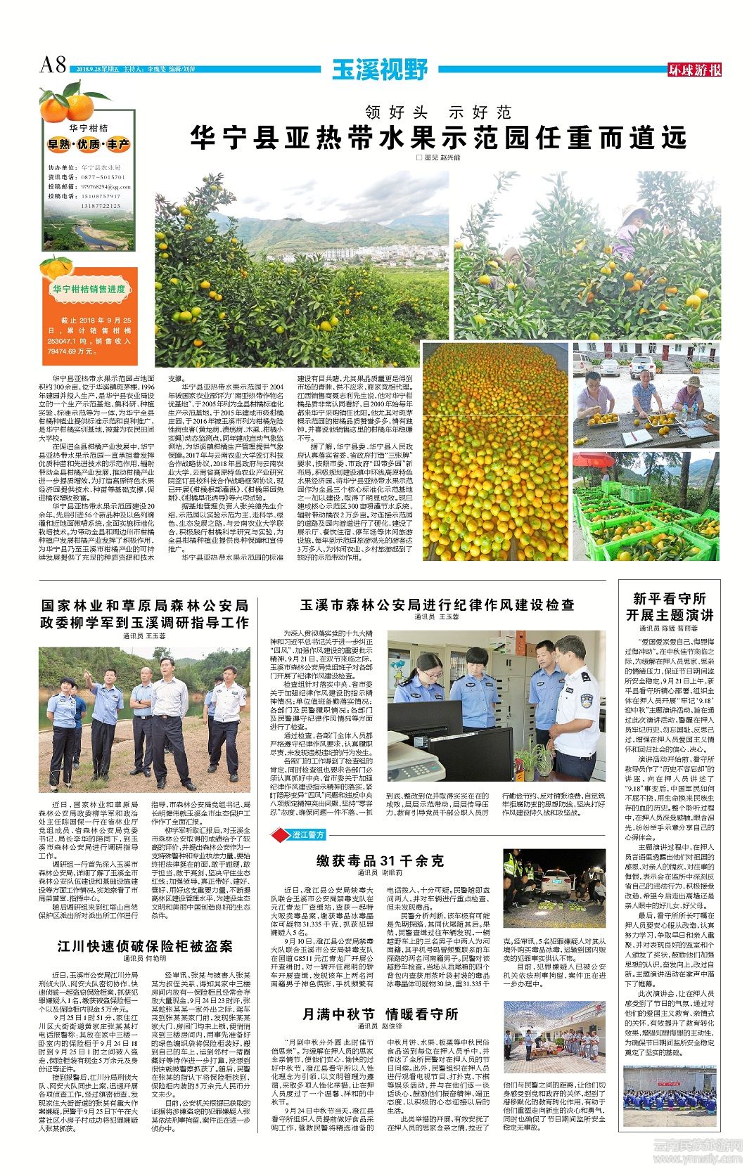 華寧縣亞熱帶水果示范園于2004年被國(guó)家農(nóng)業(yè)部評(píng)為“南亞熱帶作物名優(yōu)基地”,于2005年列為全縣柑橘標(biāo)準(zhǔn)化生產(chǎn)示范基地,于2015年建成市級(jí)柑橘莊園,于2016年被玉溪市列為柑橘危險(xiǎn)性病蟲害(黃龍病、潰瘍病、木虱、柑橘小實(shí)蠅)動(dòng)態(tài)監(jiān)測(cè)點(diǎn),同年建成自動(dòng)氣象監(jiān)測(cè)站,為華溪鎮(zhèn)柑橘生產(chǎn)管理提供氣象保障。2017年與云南農(nóng)業(yè)大學(xué)簽訂科技合作戰(zhàn)略協(xié)議,2018年縣政府與云南農(nóng)業(yè)大學(xué)、云南省高原特色農(nóng)業(yè)產(chǎn)業(yè)研究院簽訂縣??萍己献鲬?zhàn)略框架協(xié)議,現(xiàn)已開展《柑橘根部灌溉》、《柑橘果園免耕》、《柑橘早花誘導(dǎo)》等六項(xiàng)試驗(yàn)。