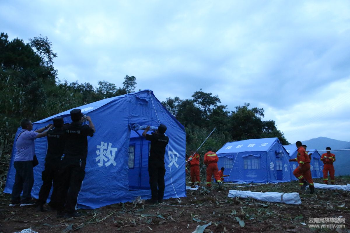 為避免發(fā)生次生災(zāi)害,由墨江縣公安局巡特警大隊(duì)、交警大隊(duì)和寧洱縣公安局民警組成的救援隊(duì),在完成搜救工作確認(rèn)無被困人員后,及時對危房設(shè)置了警戒。趕在天黑前,在村子附近較為開闊的安全區(qū)域,搭建了40余頂帳篷,讓全村群眾有了棲身之所。