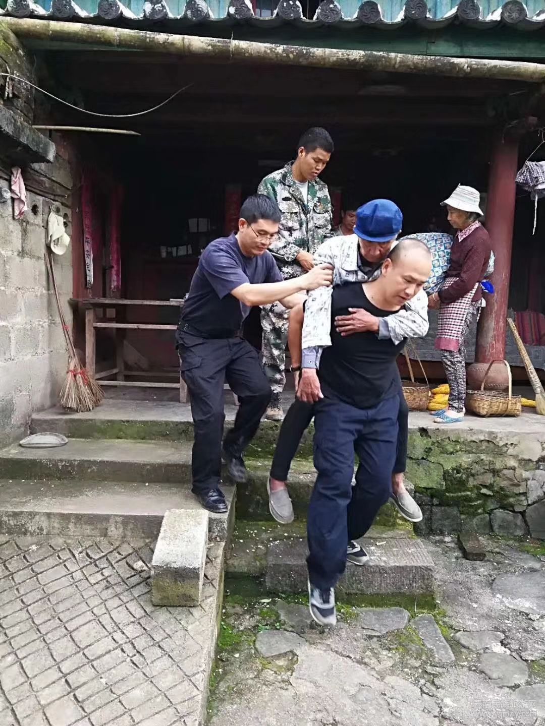 民警郭明柱、楊進(jìn)偉和協(xié)警羅金,把老人背出搖搖欲墜的危房,安置到了附近的安全區(qū)域。