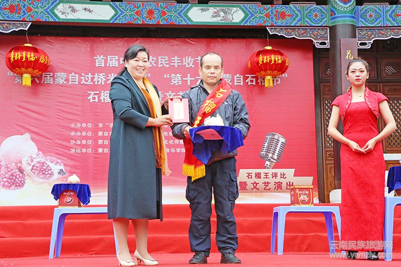 國慶節(jié)期間,蒙自市石榴公園熱鬧非凡,10月2日,蒙自市在石榴公園舉辦了首屆中國農民豐收節(jié)、“第六屆蒙自過橋米線”、“第十六屆蒙自石榴節(jié)”石榴王評比暨文藝演出,一個重1008克、外型漂亮的石榴獲得了2018年蒙自“石榴王”稱號。