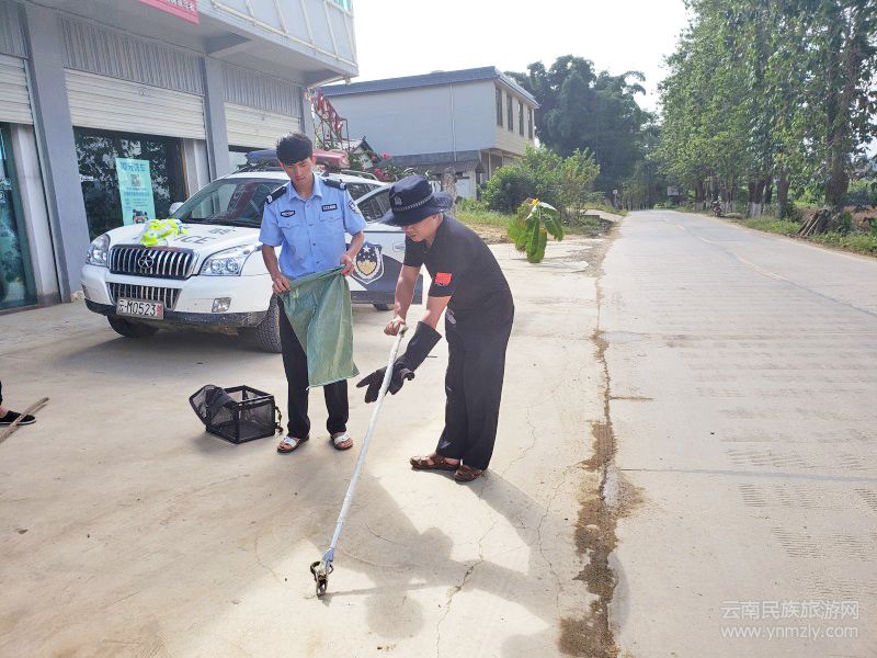 昌寧縣森林公安局勐統(tǒng)林區(qū)派出所民警趕到現(xiàn)場(chǎng),通過詢問得知,闖入家中的是一條一米多長(zhǎng)、拇指粗細(xì)的蛇,現(xiàn)在藏匿于車庫(kù)內(nèi)。了解現(xiàn)場(chǎng)情況后,民警戴好手套,使用工具,在李先生的指引下,在車庫(kù)內(nèi)搜尋蛇位置,由于蛇受到了驚動(dòng),正四處亂竄,見此情形,民警眼捷手快,立刻使用捕蛇器將蛇捕獲,放進(jìn)了編織袋中。