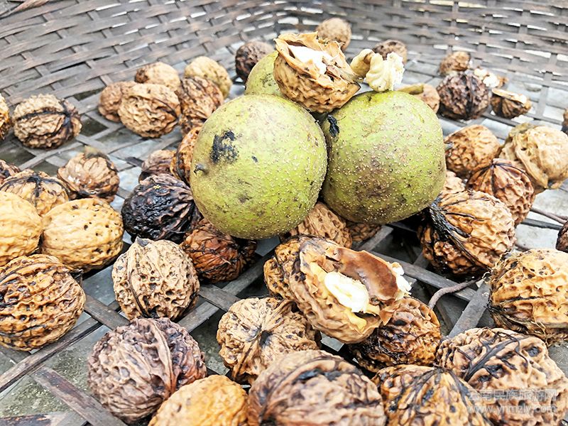 古樹太高,采摘核桃也是門技術(shù)活,需要找爬樹高手幫忙。人踩在樹枝上用長竹竿將核桃打落在地,然后再從地上一個(gè)一個(gè)的撿拾,用背簍背回來。