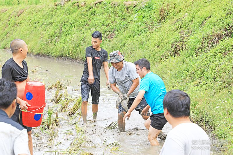 稻花魚文化節(jié)在歌舞節(jié)目《開門紅》的表演中拉開序幕。精彩的表演贏得游客陣陣喝彩。在捕魚大賽現(xiàn)場,秋風(fēng)送來縷縷稻香。賽事一開始,男女老幼分成紅、黃兩隊下田捉魚,場面非常熱鬧。田坎上圍觀的游客也樂得合不攏嘴。