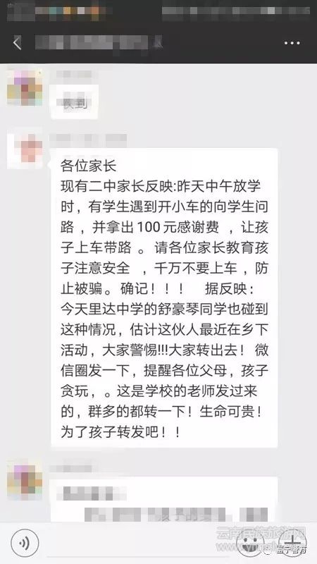 近日,富寧微信朋友圈和微信群有人在大量轉(zhuǎn)發(fā)“各位家長(zhǎng),現(xiàn)有二中家長(zhǎng)反映:昨天中午放學(xué)時(shí),有學(xué)生遇到開(kāi)小車的向?qū)W生問(wèn)路,并拿出100元感謝費(fèi),讓孩子上車帶路。請(qǐng)各位家長(zhǎng)教育孩子注意安全,千萬(wàn)不要上車,防止被騙。確記?。?!據(jù)反映:今天里達(dá)中學(xué)的舒豪琴同學(xué)也碰到這種情況,估計(jì)這伙人最近在鄉(xiāng)下活動(dòng),大家警惕?。?!大家轉(zhuǎn)出去!微信圈發(fā)一下,提醒各位父母,孩子貪玩。這是學(xué)校的老師發(fā)過(guò)來(lái)的,群多的都轉(zhuǎn)一下!生命可貴!為了孩子轉(zhuǎn)發(fā)吧?。?!”的言論。