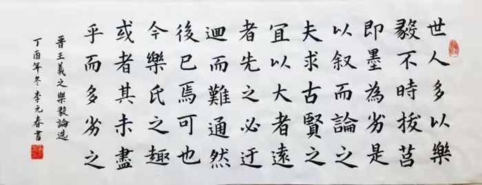 李元春先生的作品,版式清秀,結(jié)字嚴(yán)謹(jǐn),行筆流暢,王體突顯,基本功厚實(shí),其成果得到各方好評(píng)。