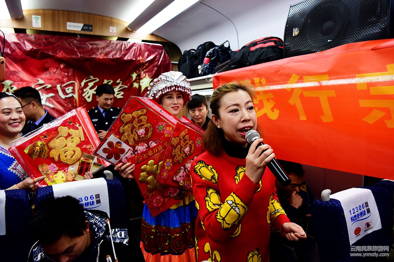 9點(diǎn)列車出發(fā),在狹小的列車空間里,民警通過歌舞、器樂演奏等內(nèi)容豐富、形式多樣的節(jié)目,向乘客們傳遞新春的祝福。開場的國家非物質(zhì)文化遺產(chǎn)的石屏海菜腔,煙盒伴舞讓旅客們感受到云南少數(shù)民族原生態(tài)音樂的美麗;葫蘆絲演奏《月光下的鳳尾竹》、吉他彈唱《在他鄉(xiāng)》、《一封家書》勾起了游子回鄉(xiāng)的思緒,營造了濃濃的返鄉(xiāng)氛圍;一名回建水過年的旅客一曲《團(tuán)圓酒》獨(dú)唱,優(yōu)美的歌聲表達(dá)了對(duì)家鄉(xiāng)對(duì)親人的愛;春節(jié)拜年歌曲串燒把列車春晚氣氛推向了高潮。