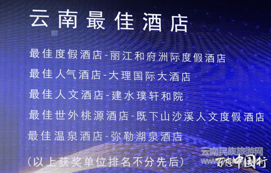 獲得云南最佳酒店獎(jiǎng)的分別是“最佳度假酒店麗江”和府洲際度假酒店、“最佳親子酒店” 西雙版納洲際度假酒店、“最佳商務(wù)酒店”昆明中維翠湖賓館、“最佳人氣酒店”大理國(guó)際大酒店、“最佳人文酒店”建水璞軒和院、“最值得期待酒店”玉龍灣湖景酒店、“最佳世外桃源酒店”既下山沙溪人文度假酒店、“最佳小而美酒店”麗江云澗度假酒店、“最佳溫泉酒店”彌勒湖泉酒店、“最佳休閑商務(wù)酒店”大理維笙山海灣酒店;