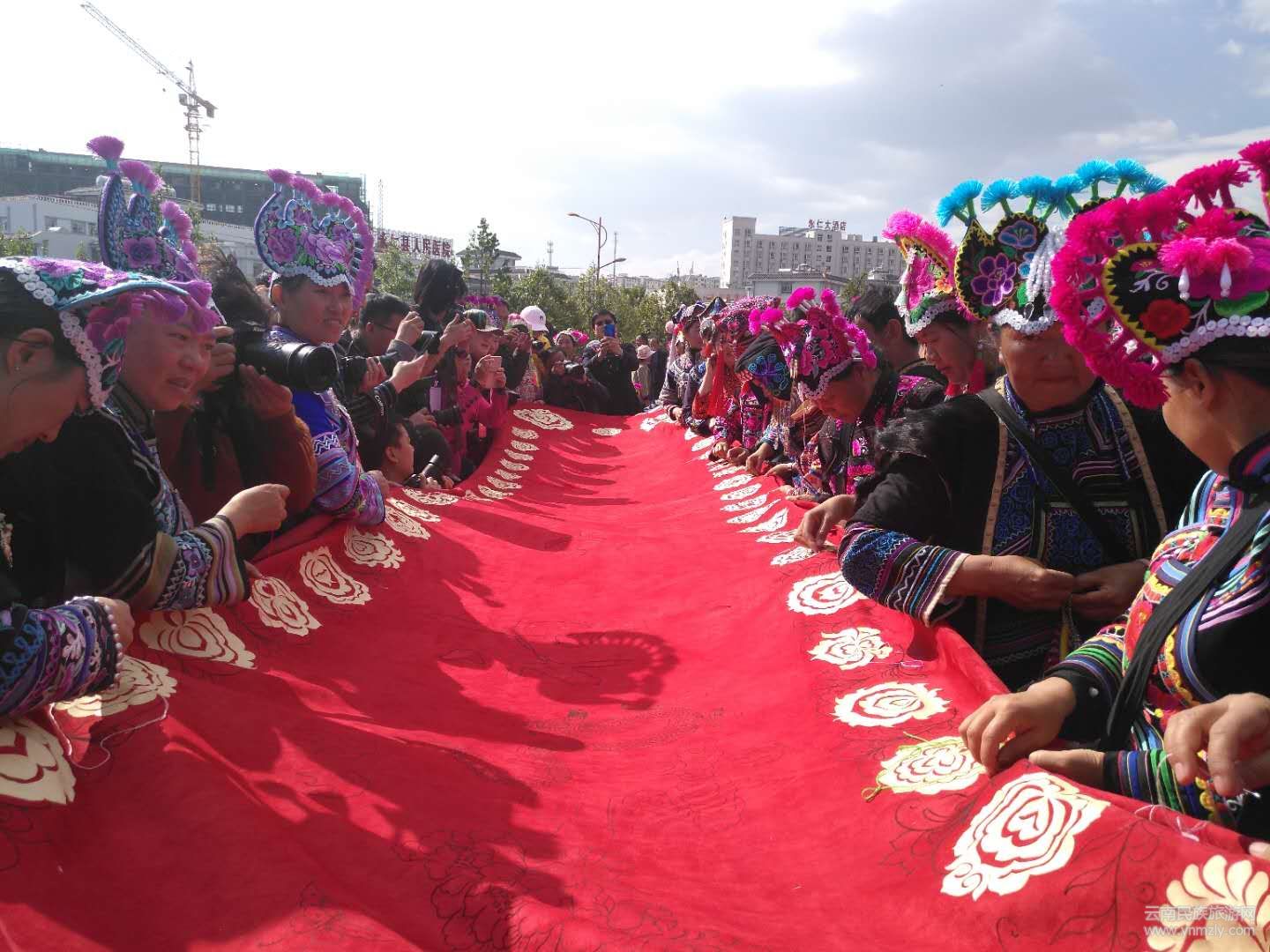 2月19日,在楚雄州永仁縣賽裝文化廣場(chǎng)的“賽裝之源”雕塑下,9位非物質(zhì)文化遺產(chǎn)傳承人和刺繡工藝大師共同為70米刺繡長(zhǎng)卷開(kāi)針,上千名彝族姑娘們身著節(jié)日盛裝,齊齊舉起手中的繡花針,在長(zhǎng)卷上繡出活靈活現(xiàn)的圖案。