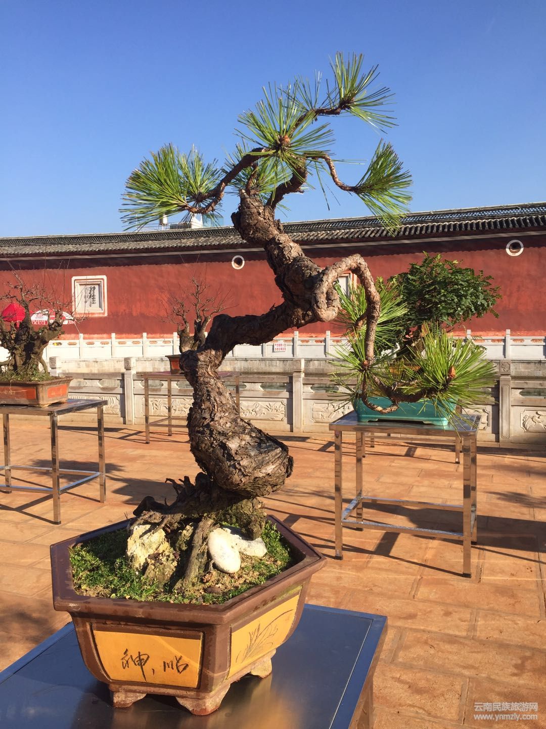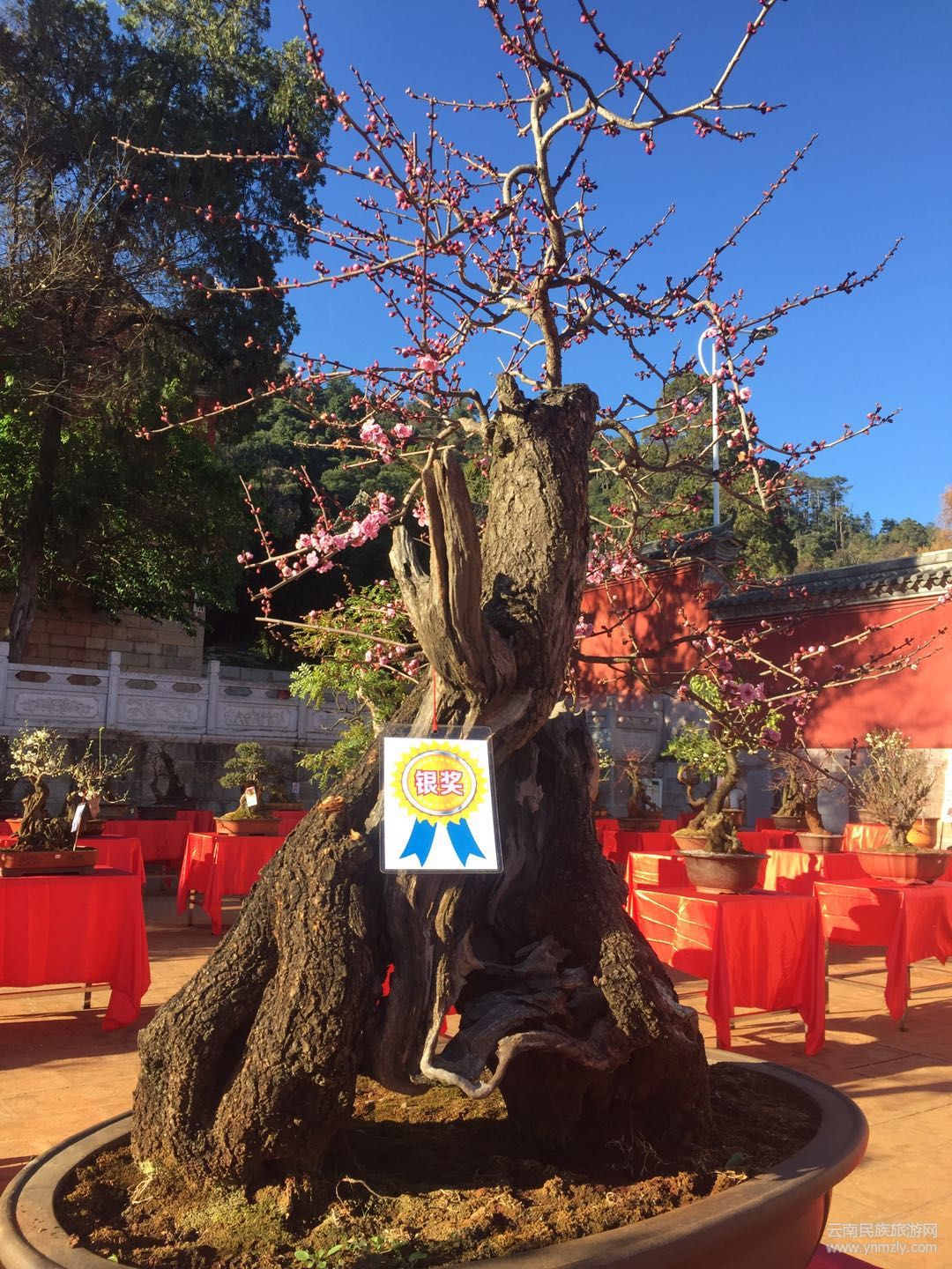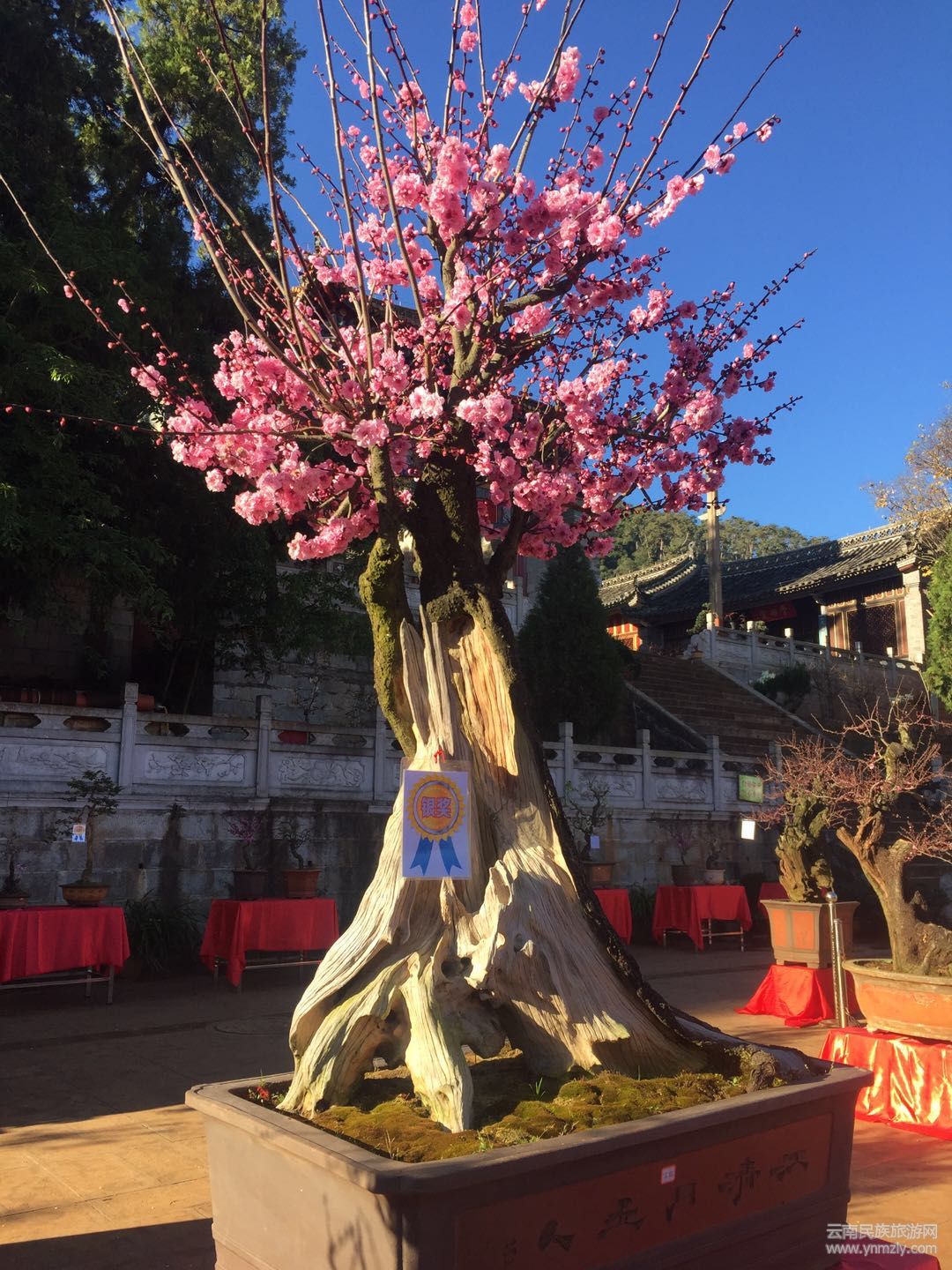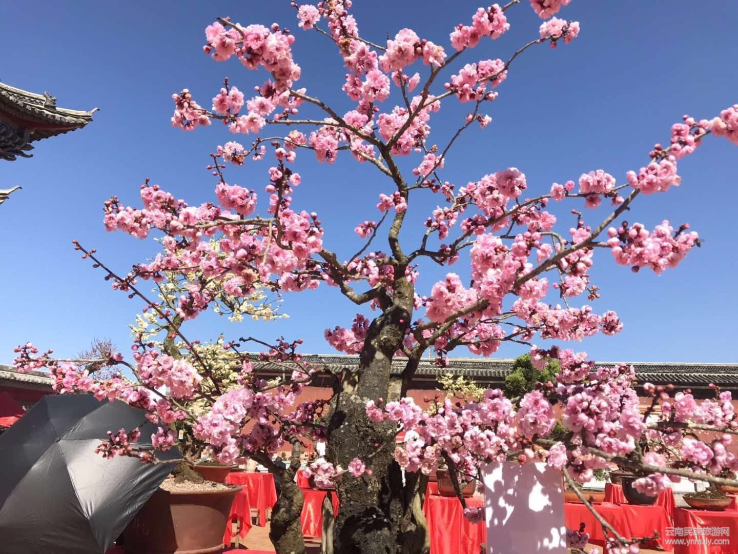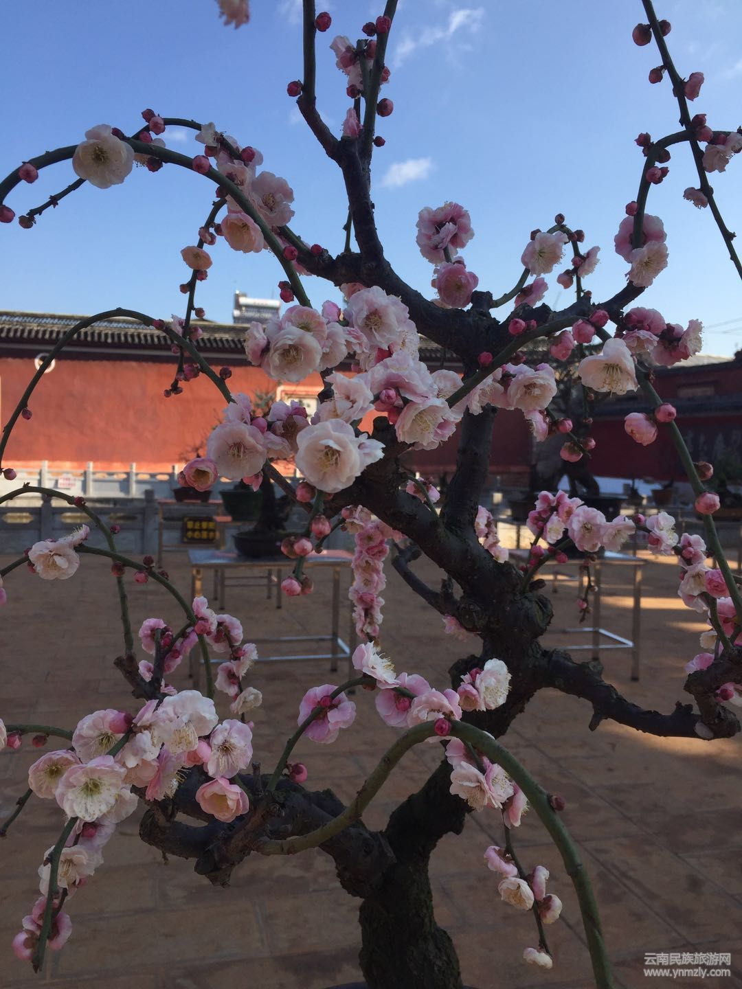 在明媚的春光中,走進(jìn)建筑別致、環(huán)境幽靜、空氣清新的通海文廟,以紅梅、綠萼梅、宮粉、朱砂等梅樁為主,兼有清香、迎春、鬼柳、小石積、黃楊、杜鵑等的各種花樁盆景在錯(cuò)落有致的展桌上各展其姿。千姿百態(tài)的盆景有的盤根錯(cuò)節(jié)、虬曲多姿,有的枝橫干斜、葉密色翠;有的或氣勢(shì)磅礴、或小巧玲瓏、或別致典雅,還有的繁華與古樸蒼勁的枯樹樁相映成趣,令人產(chǎn)生無限遐思。