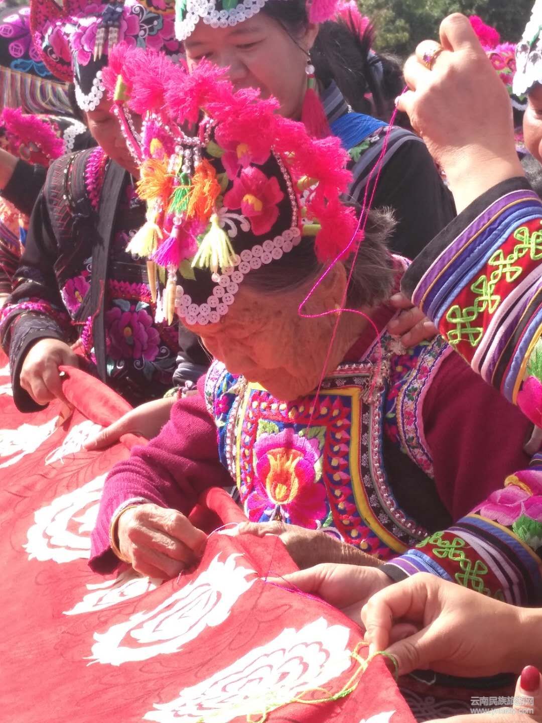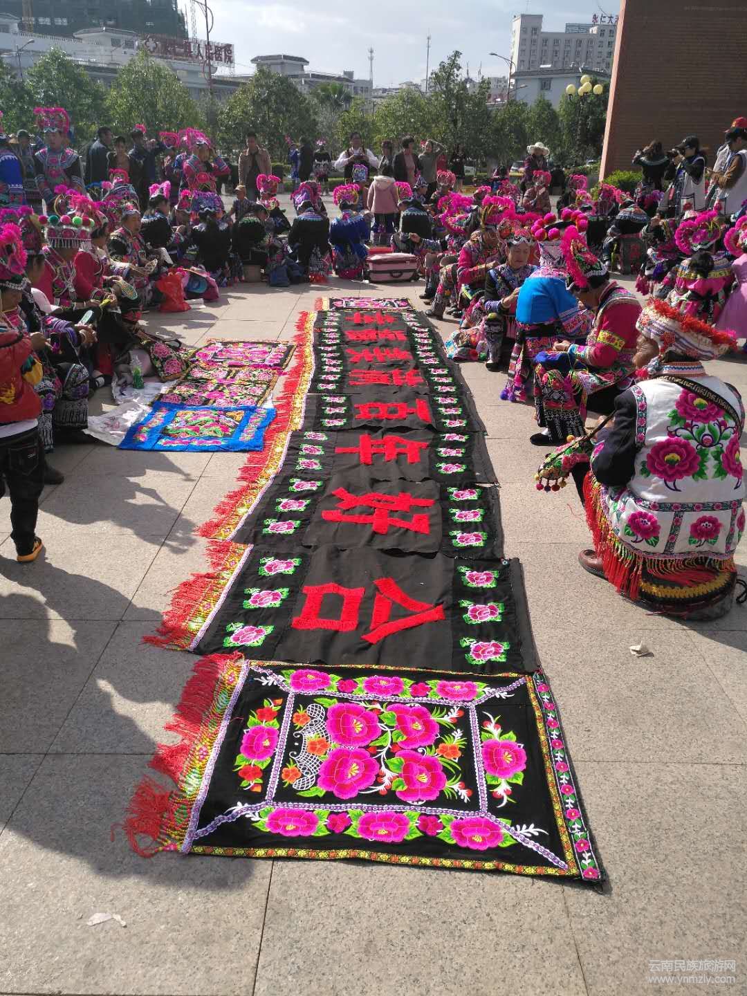 在永仁縣賽裝文化廣場的“賽裝之源”雕塑下,9位非物質(zhì)文化遺產(chǎn)傳承人和刺繡工藝大師共同為70米刺繡長卷開針,上千名彝族姑娘們身著節(jié)日盛裝,齊齊舉起手中的繡花針,在長卷上秀出活靈活現(xiàn)的圖案,表達(dá)對(duì)偉大祖國的祝福。