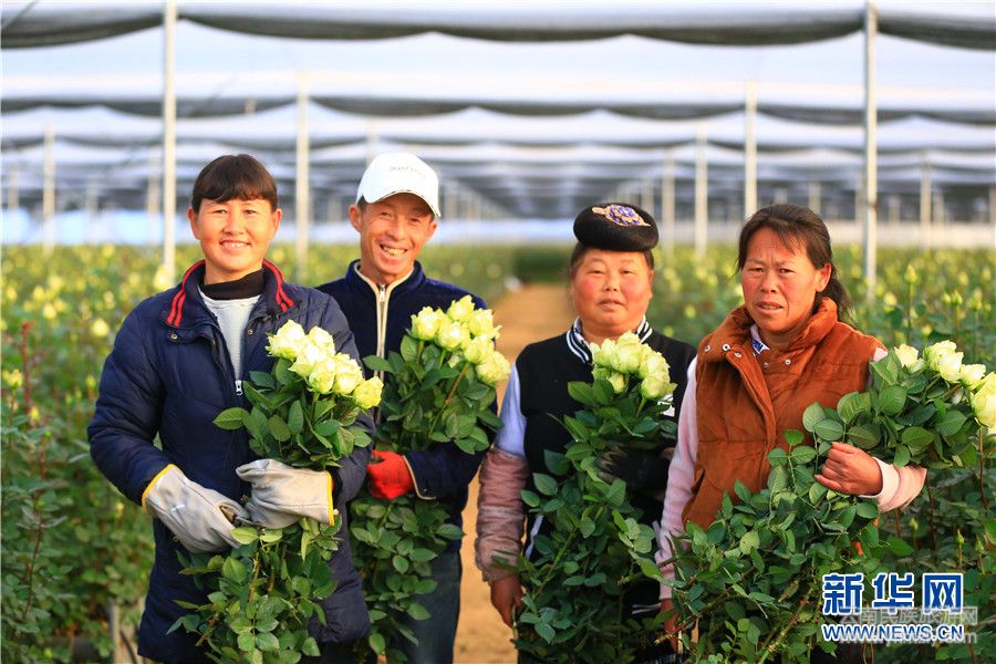 楊學彩(左1)和花農(nóng)們在種滿玫瑰的大棚里。(新華網(wǎng) 丁凝 攝)