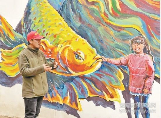 2017年2月,孫海平從昆明學(xué)院到關(guān)中村駐村后,就思考著如何把扶貧工作和自己的藝術(shù)專業(yè)結(jié)合起來。他發(fā)現(xiàn)村里新建的房子都是白墻,想把白墻利用起來。“我從事繪畫專業(yè),來到村里后,被這里美麗的自然環(huán)境所吸引,眼里看到的全是綠水青山,非常適合作畫。”于是,2017年底,孫海平邀請(qǐng)馬來西亞藝術(shù)大師賴偉權(quán)到關(guān)中村走訪,在石門小組村民舒順林家墻壁上畫出了第一幅壁畫——《走向新生活》。