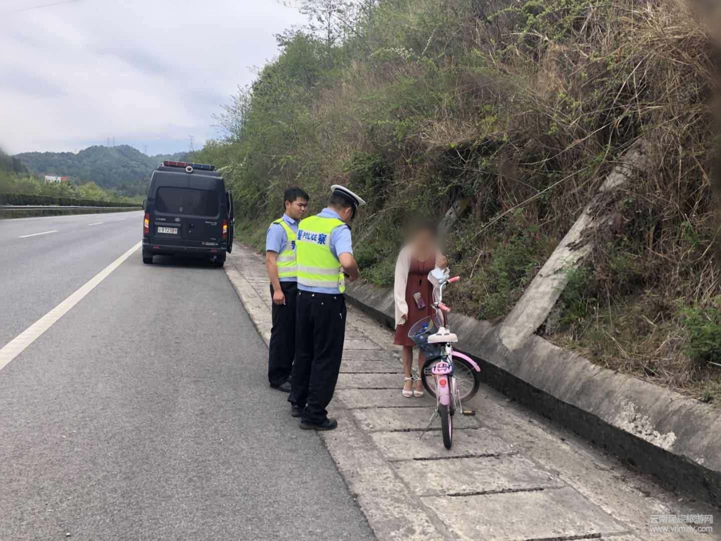 4月22日,保山市公安局交警支隊保騰高速公路交巡警大隊民警開展巡邏工作時,遇到一在高速公路騎自行車的女子。